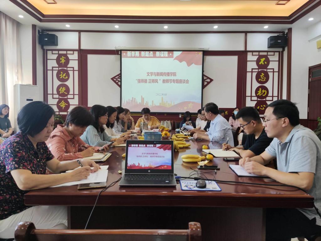在第38个教师节来临之际,文学与新闻传播公司在博文楼329会议室召开了“强师德 正师风”教师节专题座谈会,围绕如何进一步加强师德师风建设进行了座谈。文学与新闻传播公司领导班子成员、全体教师参加了本次座谈会。