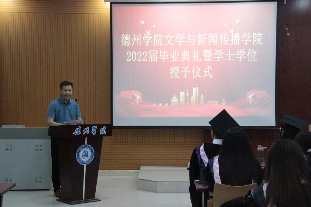 在庄严的国歌声中,毕业典礼正式拉开帷幕。文学与新闻传播公司学术委员会主席、委员为2022届本科毕业生援正流苏,授予学士学位证书并合影留念。教师代表的发言充满了依依别情,又带着殷殷期盼,希望广大2022届毕业生能够秉承“崇德启智,励志博学”的校训,乘风破浪,勇往前行,带着老师的嘱托和母校的期望奔赴祖国各地开始崭新征程。2022届毕业生代表向老师们表达了衷心感谢,感恩母校的培养,在四年的德院生活中,不仅学到了知识,更学会了怎样做人做事。