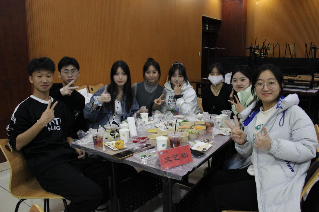“冬至阳生春又来”,在这个岁末的冬至佳节,暖冬活动于激昂的歌声中热烈开场。动人的旋律似冬日暖阳,瞬间驱散寒意,点燃了现场的热情,将大家带入轻松愉悦的氛围。此时,户外虽寒风凛冽,室内却暖意融融,一场温馨欢乐的聚会正当时。在食材准备过程中,各种趣味小游戏轮番登场。在你画我猜中,比划的同学手脚并用,猜词的同学全神贯注,欢笑声此起彼伏;抢凳子环节,参与者绕凳疾转,音乐停即抢座,伴随着同学们的呐喊助威,将现场气氛推向高潮。这些游戏不仅带来了欢乐,更在无形中增进了同学们之间的了解与信任,让大家在轻松的氛围中学会了团队协作与沟通技巧。伴随着游戏的欢乐进行,大家亲手制作的饭团、热气腾腾的饺子,以及散发着宜人香气的冬日养生茶纷纷被端上桌来,同学们围坐一处,畅快地品尝着自己的劳动成果,家人们虽不在身边,但此刻身边的伙伴就是亲人,大家心连着心,一同度过这个特别的冬至,让团圆之情在温暖的氛围中不断延续。