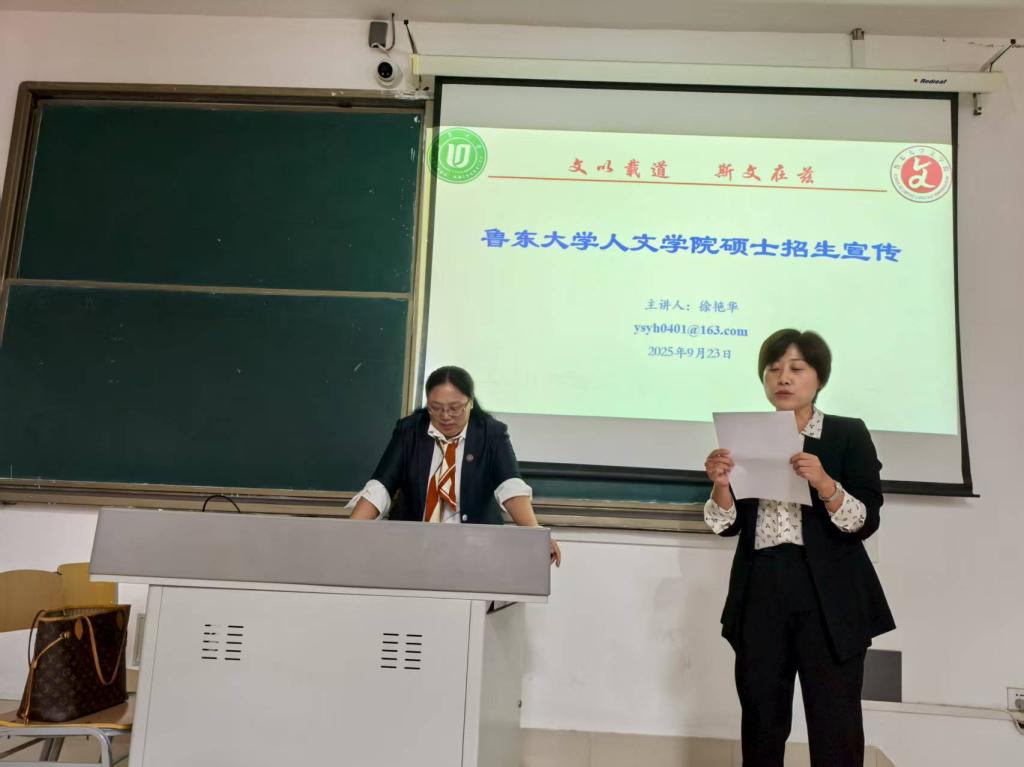 宣讲会上,徐艳华教授围绕“国际中文教育硕士培养模式与特色”,系统介绍了鲁东大学人文公司学科平台、培养方案与奖助体系。她指出,专业实行“1年理论+1年国内外实习+1年实践论文”的三段式培养,推行校内外“双导师”制,建有国家语委汉语辞书研究中心、山东省语言文字推广基地等高水平平台,着力提升员工的中华优秀文化传播能力与跨文化执教力。